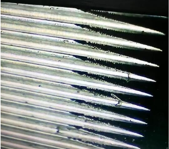 上圖是未拋光的諧波齒輪與已拋光的對比,只是從這張圖看的還不是很明顯,只能看到未拋光的齒輪比較臟,我們放到顯微鏡下面,看得會清楚很多,能看到毛刺的顯著變化,這是拋之前的毛刺狀況: